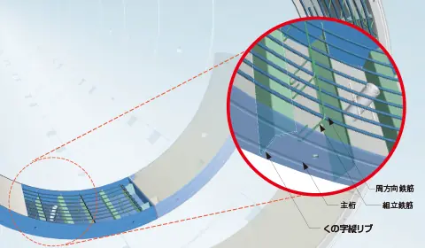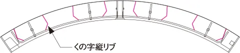 『くの字縦リブ』縦リブを「く」の字に加工することで、鋼殻と中詰コンクリートのトンネル半径方向/周方向のずれを防止し、鋼殻と中詰コンクリートの一体化を実現します。