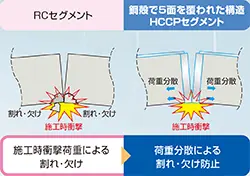 急曲線部のトンネル覆工には、施工時にセグメントに局所的な荷重が作用し、通常のRCセグメントでは想定以上のひび割れや割れ・欠けなどが発生し、トンネル品質の著しい低下を招くことがあります。HCCP®セグメントは鋼殻で覆われた構造ですので、中詰めコンクリートの損傷を防ぐことができます。