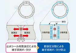 - ※トンネル内への漏水は、長期的なトンネル耐久性に悪影響を及ぼし、さらにトンネル周辺、地表面に想定外の変動を引き起こす原因となります。コンクリートは耐衝撃性に劣るため、施工時に割れ・欠けが発生しやすく、長期的な止水性能が低下する可能性があります。