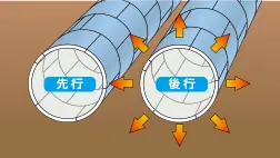 併設トンネルでは、先行トンネルは後行トンネルの掘削影響(切羽圧、裏込め注入圧など)を受けます。また、この影響はトンネル間の距離が近いほど大きくなります。HCCP®セグメントは薄壁構造ですので、トンネル間の距離を拡げることが可能であり、さらに後行トンネルの掘削影響に対してもその高耐力性能で対応できます。