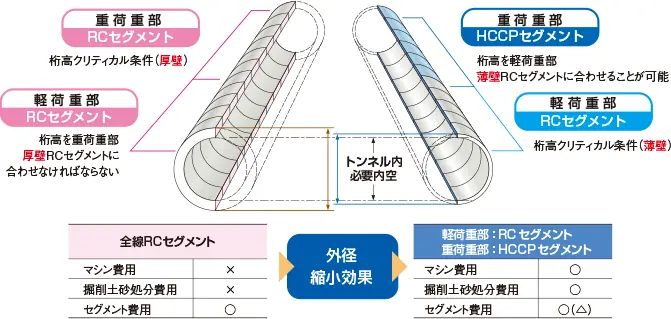 多様な設計条件に対して、例えば「一般部:RCセグメント、重荷重部:HCCPセグメント」のように最適なセグメントを選択することで、トータルコストの削減が可能になります。