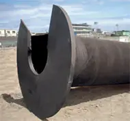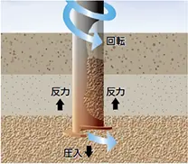 NSエコパイル®は、先端に「螺旋状の羽根」を設けた鋼管を回転圧入する工法です。羽根のくさび効果で地盤を上方に押上げ、その反力を推進力とすることで、地盤へのスムーズな貫入が可能となります。また、羽根の拡底効果により、高い押込み・引抜き支持力を発揮します。