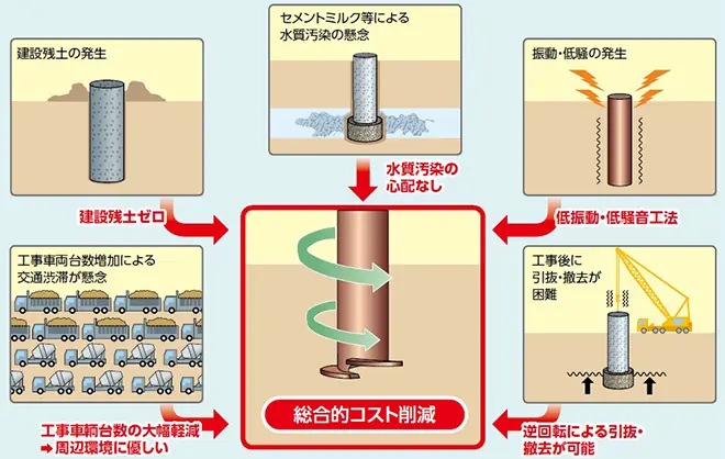 - 1無排土施工の実現により、残土や汚水が発生せず、土砂搬出ダンプが走行しないため、周辺環境対策に最適です。