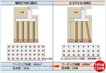 ただし、支持層は砂、砂礫、風化花崗岩を基本とします。 - 4斜杭施工により、杭本数の低減が可能です。