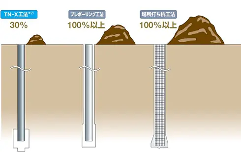 薄肉中空断面の鋼管杭を使用し、同時沈設方式(中掘り方式)の施工を行うことで、発生残土量の抑制が可能です。