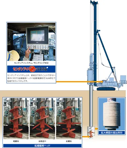 信頼性に優れる油圧式の拡縮掘削ヘッドを用いるため、拡大根固め部を確実に施工することが可能です。また、センタンアイシステム®を用いてリアルタイムに築造工程を管理することが可能です。