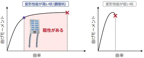 大口径である鋼管径1400mmの施工が可能であり、また鋼管杭は他材料と比べて優れた変形性能を有しているため、想定外の大地震時にも脆性破壊が起きにくい、「粘り強い」構造として高い耐震性能が発揮できます。
