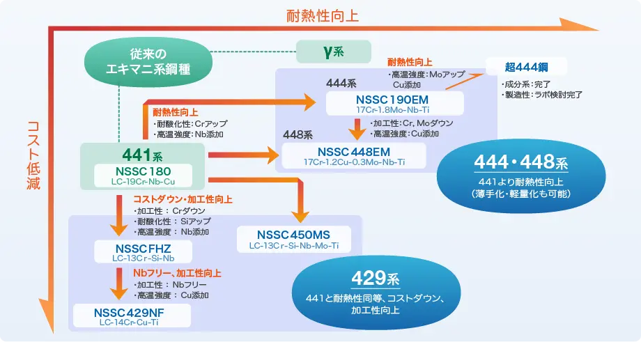 自動車エンジンの高温化に合わせ、自動車エキゾーストマニフォールド向けとして、当社では耐熱性を向上させた各種フェライト系ステンレス鋼を取り揃えています。
