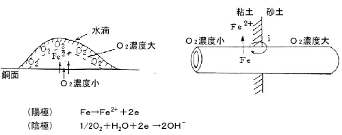酸素濃度は土壌中の腐食の重要な因子です。酸素濃度が小さいと金属の初期腐食はかなり抑制されますが、被膜を生成しにくいので長時間になると金属表面に孔食(後述)を生じやすくなります。また、酸素濃度の不一致により、腐食が起こることは、よく知られています。