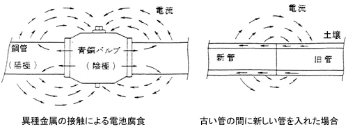 土壌中でこの種の腐食が起こる例は多く、ステンレス鋼と炭素鋼との組み合わせや次図のように、青銅バルブ(貴電位)につながった鋼管(卑電位)が腐食したり、また同種の鋼管であっても、古い管につないだ新しい管に腐食が起きることがあります。この場合、同種の管といっても、古い管の表面には長期間の埋設により安定した酸化被膜が形成されており、電位の点で異種の金属とみなすべきでしょう。