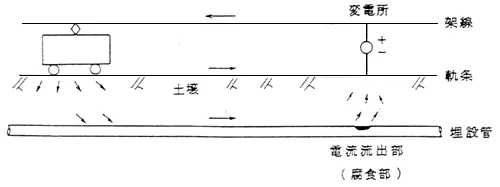 迷走電流は当然電気抵抗の小さいコースをえらんで流れますが、鋼管は絶好の電導体であるため電流が流入しやすく、再び土壌中へ流出する地点で著しく腐食し、その腐食速度はきわめて大きくなります。