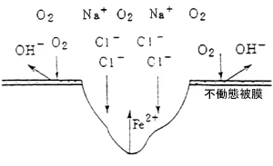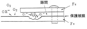 孔食は、局部的に金属表面の被膜が破壊されることにより生じます。Cl-存在下での鉄の孔食について、その状況を次図に示します。
