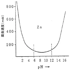 常温の場合、亜鉛は次図に示すとおりpH6~12の範囲で、有効な耐食性を示し、これ以下の酸性環境では、水素発生と共に著しく侵され、またpH12.5以上では亜鉛は、Zn+OH-+H2O → HZnO2-+H2の反応に従って急速に侵され、溶解性の亜鉛酸塩を生成します。