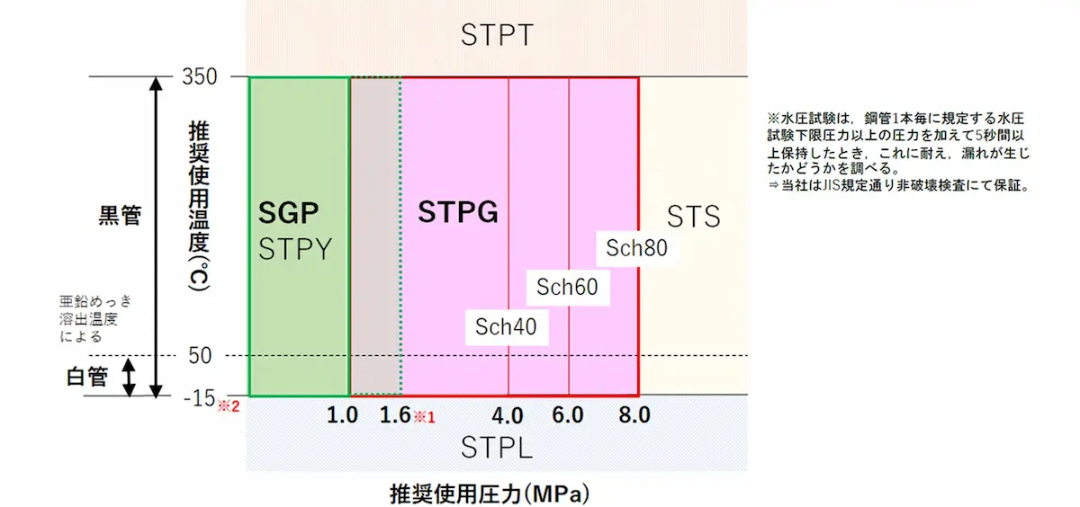 - ※1「一般に、圧力装置における水圧試験圧力は、その装置の最高使用圧力の1.5倍とされている。これによれば、この管の水圧試験圧力は25kg/㎠ (=2.5MPa)であるから、管の使用圧力は16kg/㎠(=1.6MPa)程度以下ということになる。」 (JIS G 3452.3454~60-1962 配管用鋼管解説 2.3特性2.3.1適用範囲)