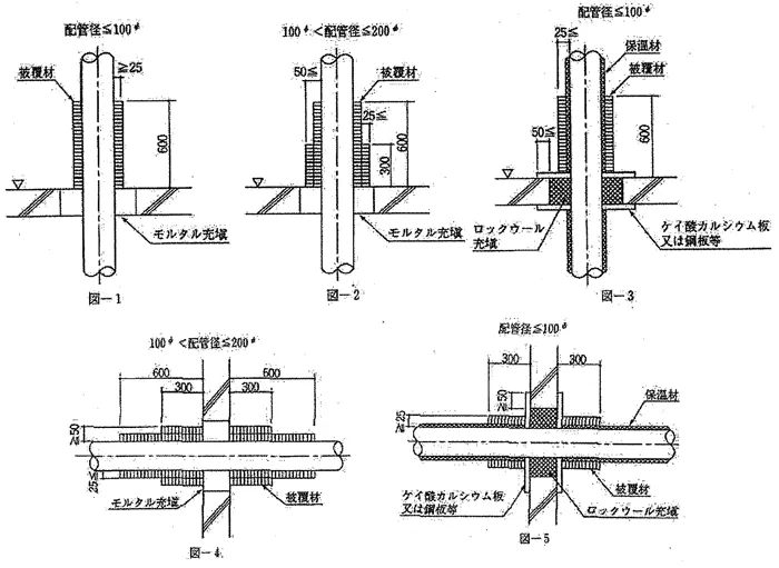 又はロックウール繊維(充填磨度150kg/m3以上のものに限る。)を利用した乾式吹き付けロックウール又は湿式吹き付けロックウールで隙間を充填すること。 - イ. ロックウール充填後、25mm以上のケイ酸カルシウム板又は0.5mm以上の鋼板を床又は壁と50m以上重なるように貫通部に蓋をし、アンカーボルト、コンクリート釘等で固定すること。