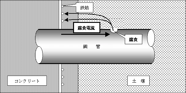 コンクリート構造物を貫通して布設される鋼管において、環境の差異(コンクリート/土壌)により電位差が生じ、巨大電池(マクロセル)が形成され、発生する腐食を言います。