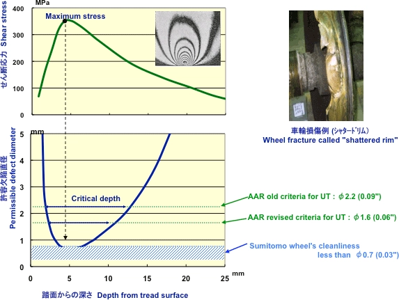 過酷な荷重条件では、車輪材料中の不純物や空孔欠陥は、内部亀裂の原因となります。したがって、北米では、貨車車輪の損傷防止のため、超音波検査基準が厳格化されました。