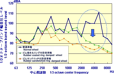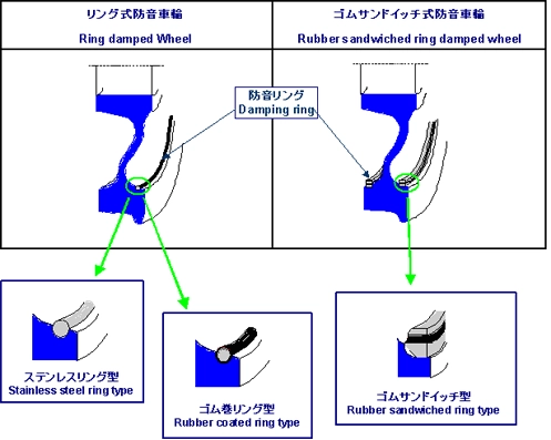 防音車輪は、車輪に取り付けた防音部材により、曲線通過時の騒音(きしり音)を抑制します。