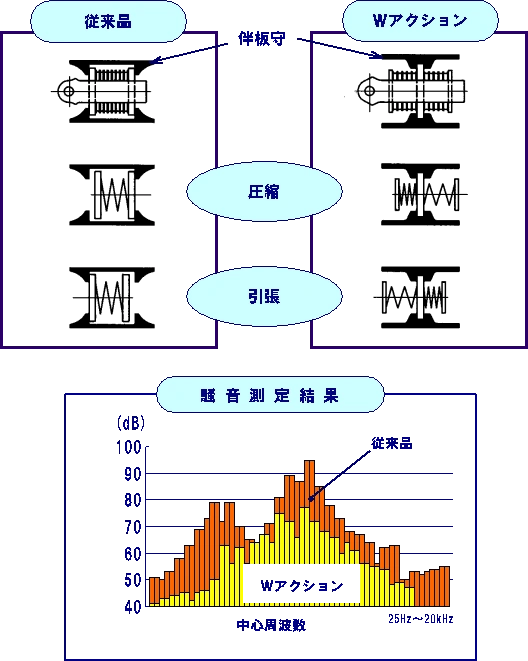 ゴム緩衝器については、車両の長大編成化および起動時及び制動時におけるショック音を防止するためにWアクション型緩衝器を開発し、民営・公営鉄道の車両に広く使用されております。