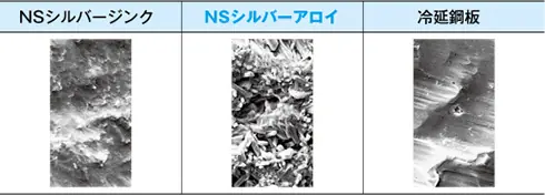 合金化溶融亜鉛めっき鋼板=NSシルバーアロイは、従来の溶融亜鉛めっき鋼板よりも優れた塗装性と溶接性をそなえており、自動車、電気機器、建材等に幅広く使われております。NSシルバーアロイは、溶融めっき後加熱処理したもので、めっき層を亜鉛̶鉄合金としています。この表面は微細な凹凸をもっており、塗装下地鋼板として最適です。