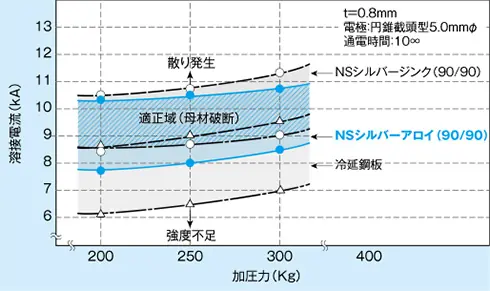 めっき鋼板の適正溶接条件を下の図に示します。めっき鋼板の適正溶接電流域は、冷延鋼板に比べ高い電流域にあります。