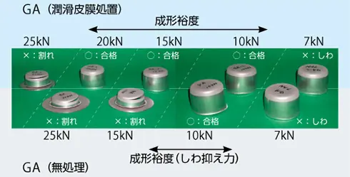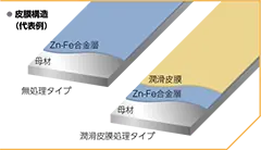めっき表面に潤滑皮膜処理を施すことで摺動抵抗を下げ、良好なプレス加工性を実現できます。