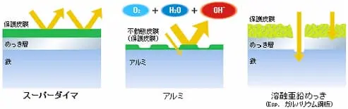 非常に腐食に強いアルミの耐食性も、その表層の不動態皮膜によるものです。めっき層にアルミを55%と多く含むガルバリウム鋼板も同様の効果を発揮します。しかし、アルミは「アルカリ」に弱いという性質があります。