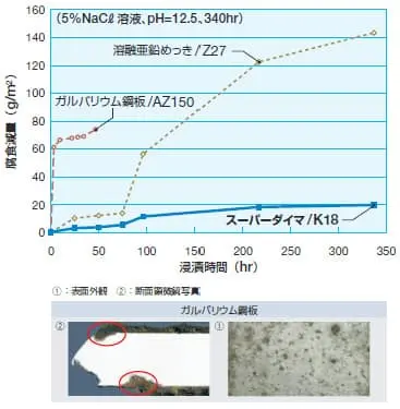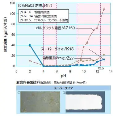 pHの高いアルカリの条件では、ガルバリウム鋼板は腐食が非常に進行しますが、スーパーダイマ®は腐食が一番少なく良好です。スーパーダイマ®は強アルカリ環境(畜舎・堆肥舎、モルタル・コンクリート)で良好です。