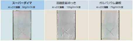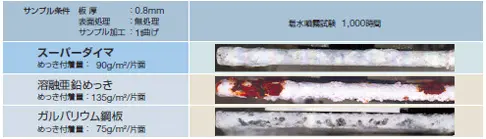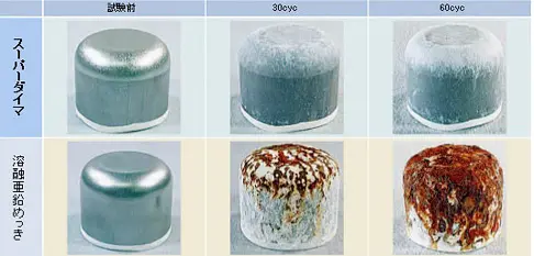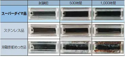 スーパーダイマ品、ステンレス品および溶融亜鉛めっき品の耐食性比較