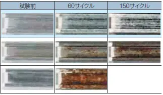 | 消毒液噴霧試験 | 次亜塩素酸ナトリウム 3mg/ℓ, 45°C (塩水噴霧試験機使用) |