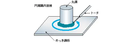 アーク溶接の場合には、通常、溶接ビード部が収縮しますが、溶接部材の構造によっては、ビード近傍の母材に大きな内部引張力が働きます。(例:円周隅肉溶接[下図参照])