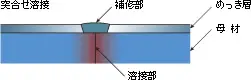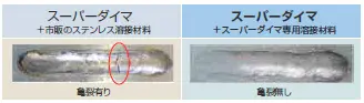 通常のステンレス溶接材料では、溶接ビード部に亀裂が入る(「溶融金属脆化割れ」現象)ので補修が必要となります。スーパーダイマ®専用溶接材料を使用することにより、ビード部のめっき脆化割れ問題を克服し、ビードを補修しなくても耐食性を確保することができます。