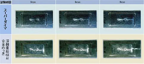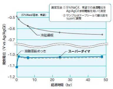 この結果より、スーパーダイマ®が異種金属と接触した場合、腐食電位に起因する接触腐食の現象は、通常の亜鉛系めっきの場合とほぼ同じであると考えられます。