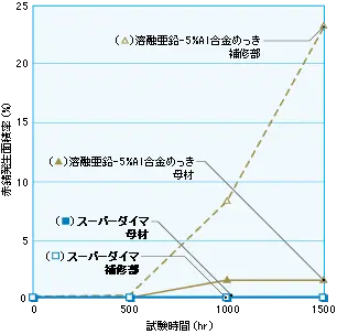 スーパーダイマ®のジンクリッチペイント補修部の耐食性は、溶融亜鉛-5%Aℓ合金めっきのジンクリッチペイント補修部に比較して、大幅に高い耐食性を示しました。