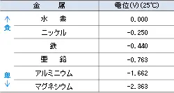 - 2種類の金属が接触した場合、電位が低い方の金属(卑なる金属)が腐食します。(下表参照:例えば、鉄と亜鉛が接触した場合、亜鉛の方が腐食します)