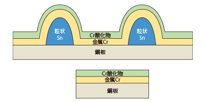 当社では、このような問題に対処するため無研削溶接用素材「キャンエクセル(CAN-EXWEL)」を開発し商品化いたしております。「キャンエクセル」は、ティンフリースチール(TFS)の優れた品質特性を損うことなく溶接性を付加した鋼板です。