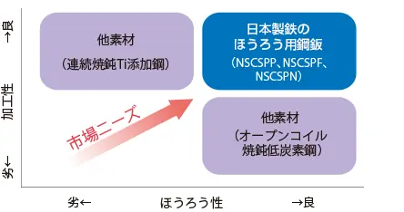 日本製鉄のほうろう用鋼板は、加工性とほうろう性(耐爪飛び性に優れる、泡、黒点、ブリスターなどのほうろう層の欠陥が少ない、密着性がよい)がともに優れる特長を持っています。