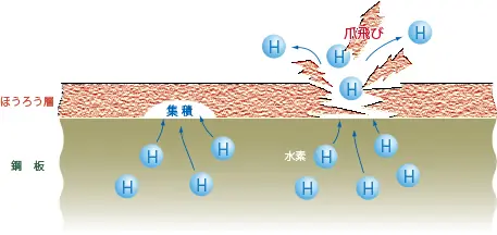 他素材に比較し、鋼板の水素吸蔵能力が高く、ほうろう層の爪飛び現象を防止できますので、両面ほうろう塗布でも同様の効果を発揮します。