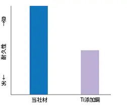 他素材に比較し優れたほうろう性(耐爪飛び性に優れる、泡、黒点、ブリスターなどのほうろう層の欠陥が少ない、密着性がよい)を発揮するので、使用環境の厳しい熱交換器エレメントに使用の場合、良好な耐久性が得られます。