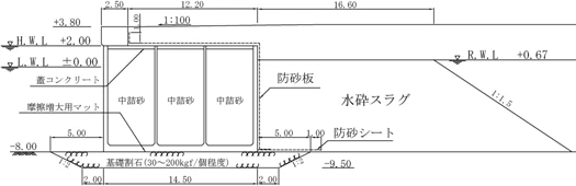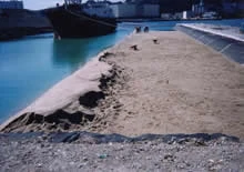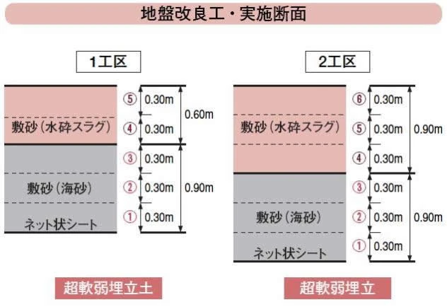 浚渫土は自然状態のままでは強固な地盤になるまでに相当長期間かかると言われており、早期に強固な地盤にするため、高炉水砕スラグが採用されました。また、高炉水砕スラグは、天然材に比べて軽量であるため、埋立地の沈下量を低減させることが評価されています。
