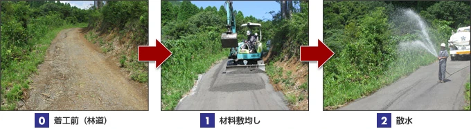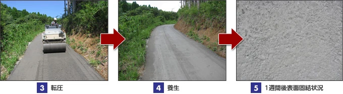 適量の散水と重機による転圧を行うだけで施工後、徐々に固化が進行します。