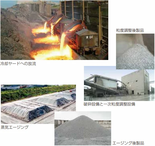 高炉で製造された溶銑やスクラップから、靭性、加工性のある鋼にするのが製鋼工程であり、製鋼炉には転炉、電気炉があります。この製鋼工程で生成するのが製鋼スラグであり、粗鋼1t当たり約100kg生成します。製鋼スラグは高炉徐冷スラグとほぼ同じ方法で加工され、各種用途に用いられます。