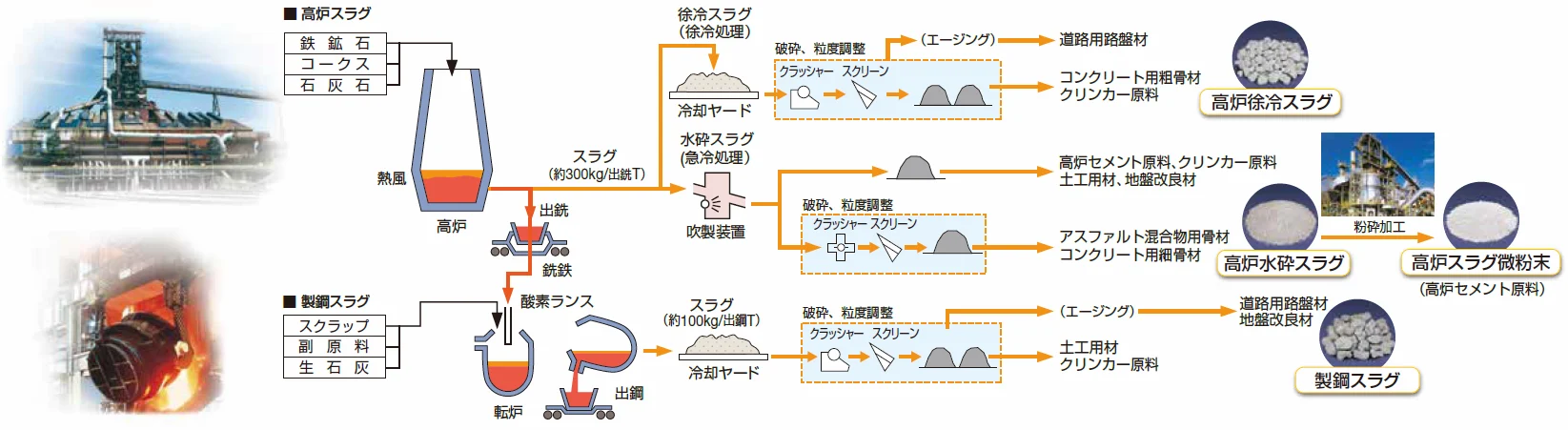鉄鋼スラグは、高炉で鉄鉱石を溶解・還元する際に発生する高炉スラグと、鉄を精錬する製鋼段階で発生する製鋼スラグに大別できます。