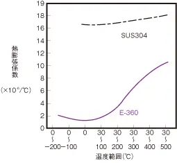 - 低温から常温付近までの熱膨張係数がきわめて小さい合金です。(SUS304の約1/10)
