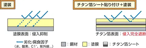 耐食性に優れたチタン箔・薄板で表面を被覆することにより、構造物の長寿命化、メンテナンスコストの低減を実現します。