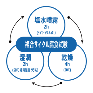 塩水噴霧(5%NaCl、35℃)2h → 乾燥 (50℃)4h → 湿潤(50℃、相対湿度95%)2h -