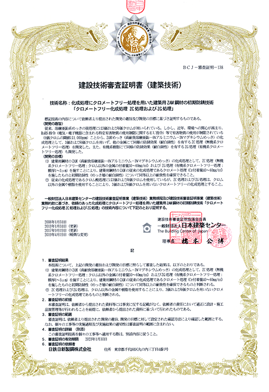 本公司的无铬后期处理也取得了 财团法人日本建筑中心的“建设技术审查证书(建筑技术)” |