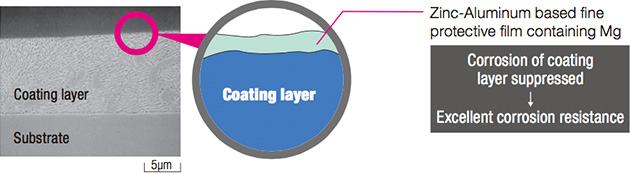 Al and Mg in the coating layer of ZAM combine to form a fine, tightly adhered zinc-based protective film on its coating surface as time passes.
