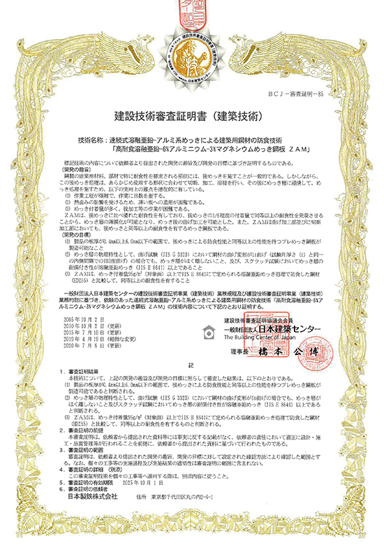 この審査証明では「めっき付着量90g/m2以上を施したZAMはJIS H 8641に規定される溶融亜鉛めっき(HDZ55)と同等以上の耐食性を有する」ことが示されています。