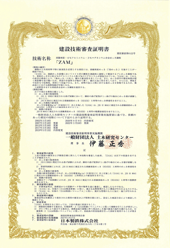 一般財団法人土木研究センターにおいて建設技術審査証明書(土木系材料・製品・技術、道路保全技術)建技審証第0122号を取得しています。